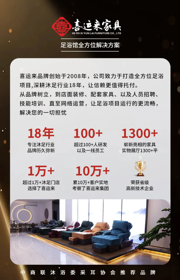 十八年匠心深耕,合肥喜运来家具有限公司正以创新之姿,重塑沐足家具行业新高度。自2008年创立以来,我们始终以“有沐足的地方,就有喜运来”为使命,致力于为全球足浴、养生、休闲会所打造高端专属空间,持续引领万亿级市场新浪潮。